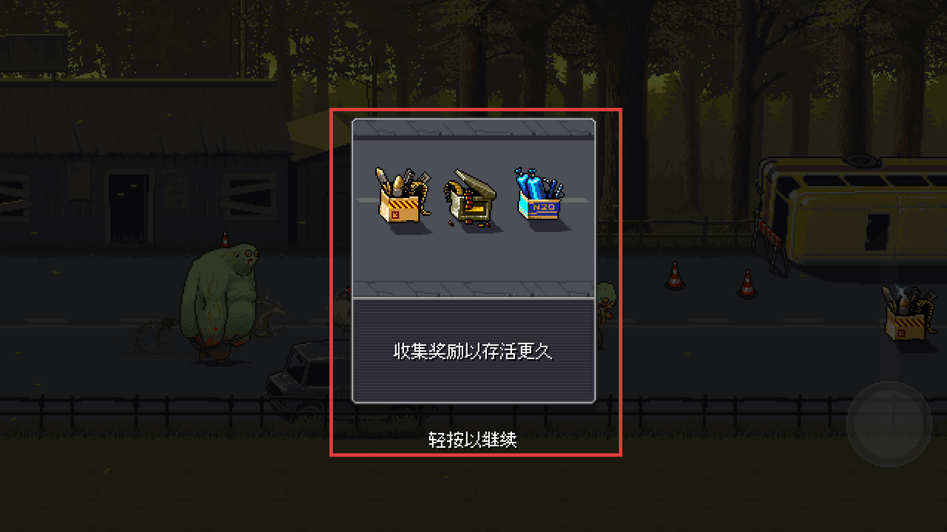 3、遇到【獎(jiǎng)勵(lì)箱】要及時(shí)收集,獲取的資源能提升生存能力,幫助在僵尸包圍中存活更久。