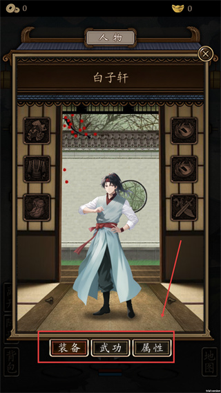 2、進入角色界面,主角名為【白子軒】,可在此界面點擊【裝備】【武功】【屬性】按鈕查看與提升能力。